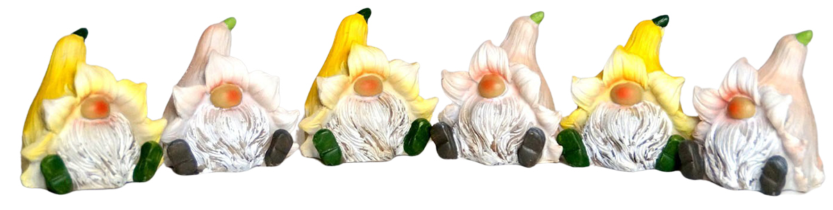 Das Set umfasst drei Gnompaare (gelb und rosa).