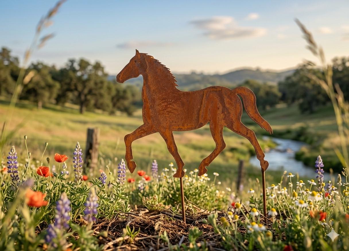 Diese elegante Pferde-Silhouette aus Metall überzeugt durch ihre dynamische Form und natürliche Rostpatina. Das detailreich gearbeitete Design zeigt ein schreitendes Pferd mit erhobenem Vorderbein und bringt Bewegung sowie Ausdruck in Ihren Garten oder Wohnbereich.