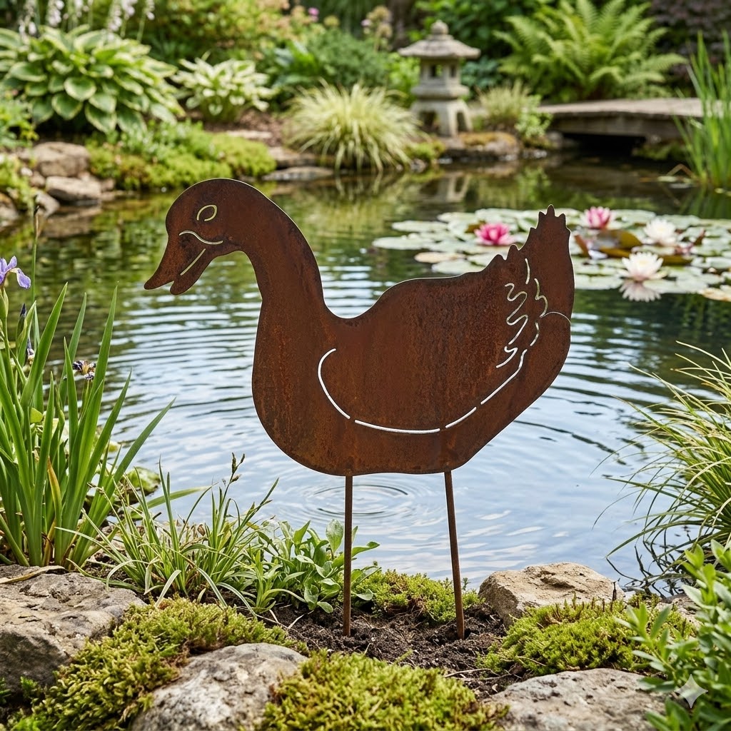 Die kunstvolle Gestaltung des Beetsteckers bereichert Ihren Außenbereich auf elegante Weise. Die mühelose Platzierung gelingt dank der stabilen Erdspieße spielend leicht, während die goldige Ente sowohl Blumenbeete als auch Ihren Blumentopf auf wundervolle Art ergänzt.