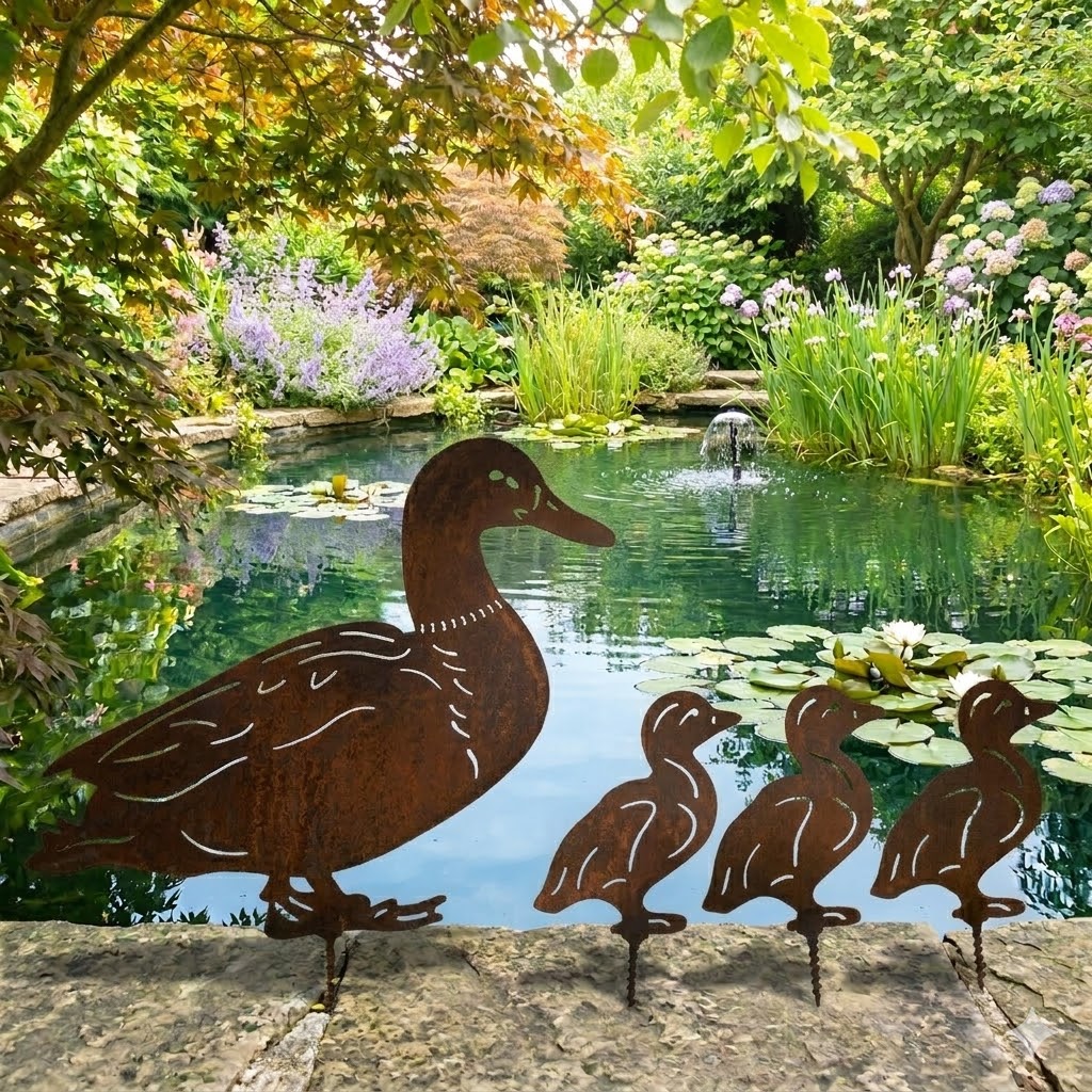 Die Beetstecker zeigen eine entzückende Entenfamilie, angeführt von einer liebevollen Entenmama und begleitet von drei niedlichen Küken.