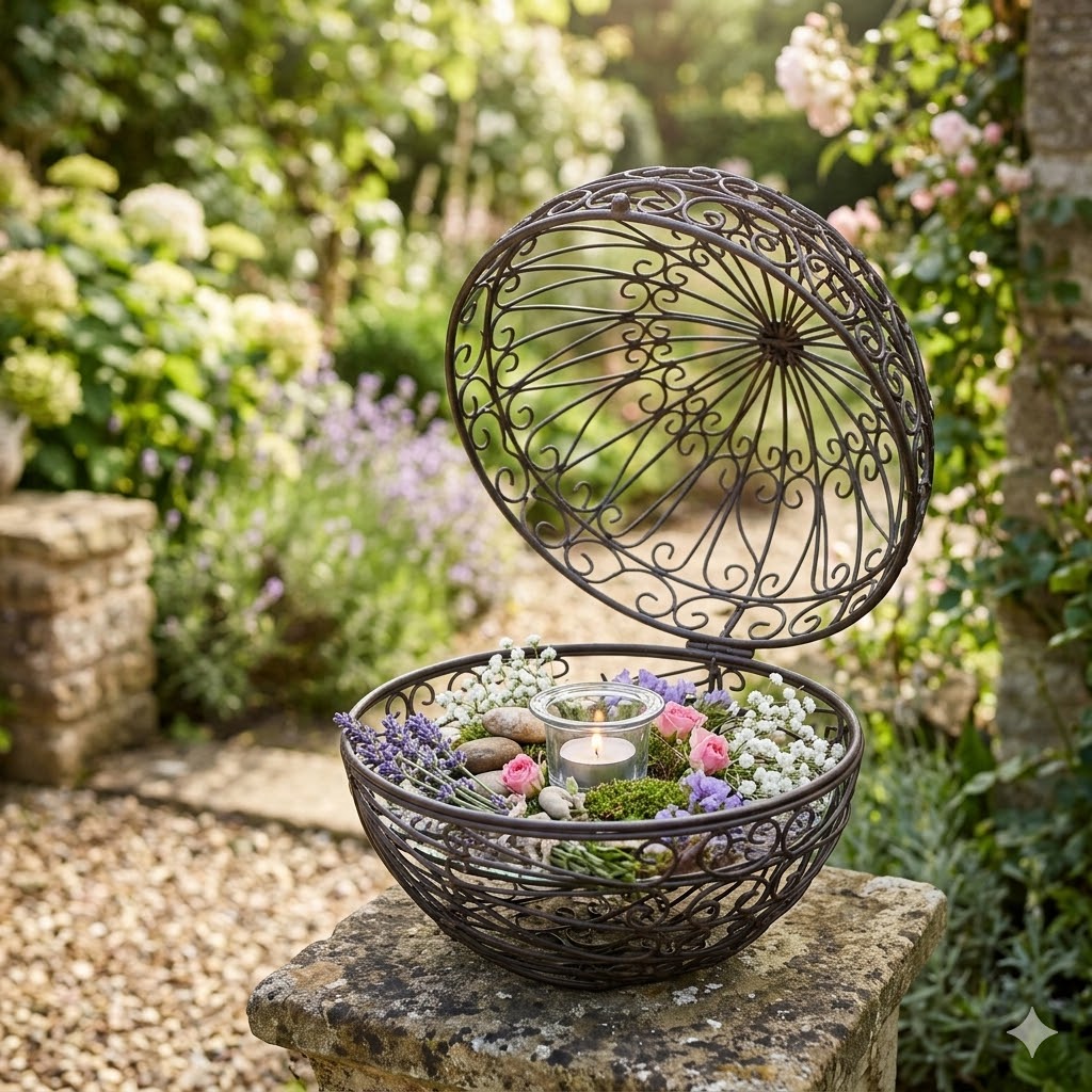 Die dekorative Gartenkugel in edlem Braun mit kunstvollen Verzierungen ist ein echter Hingucker für jeden Garten. Sie lässt sich in der Mitte öffnen und bietet so die Möglichkeit, sie individuell mit Pflanzen oder anderen Dekorationen zu befüllen. Ideal, um Ihrem Außenbereich einen Hauch von Eleganz und Persönlichkeit zu verleihen.