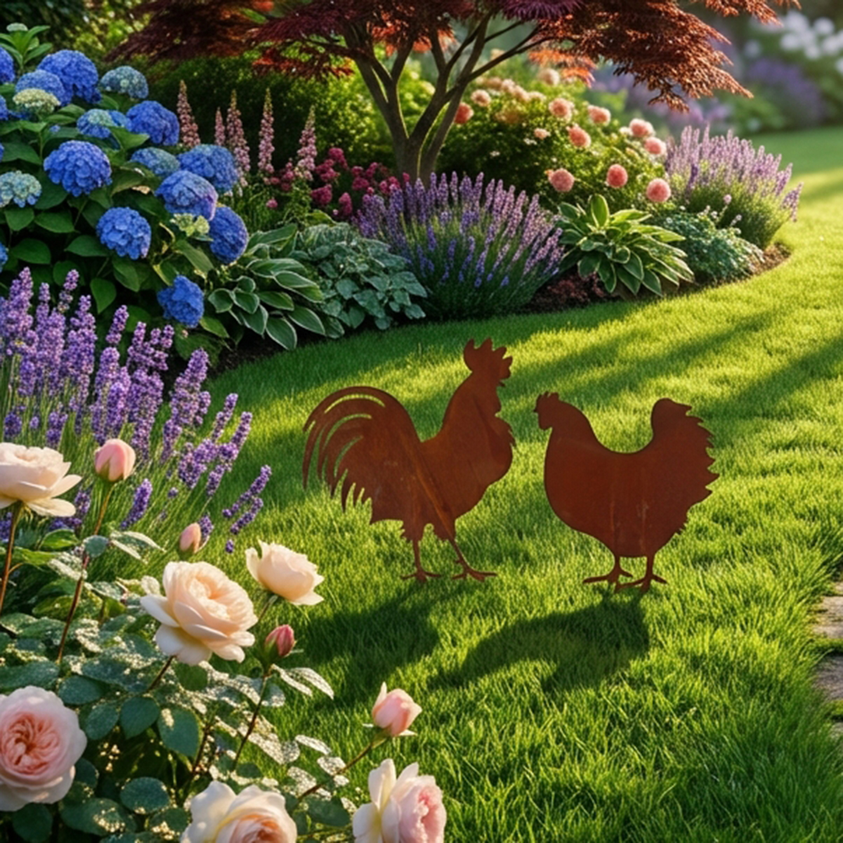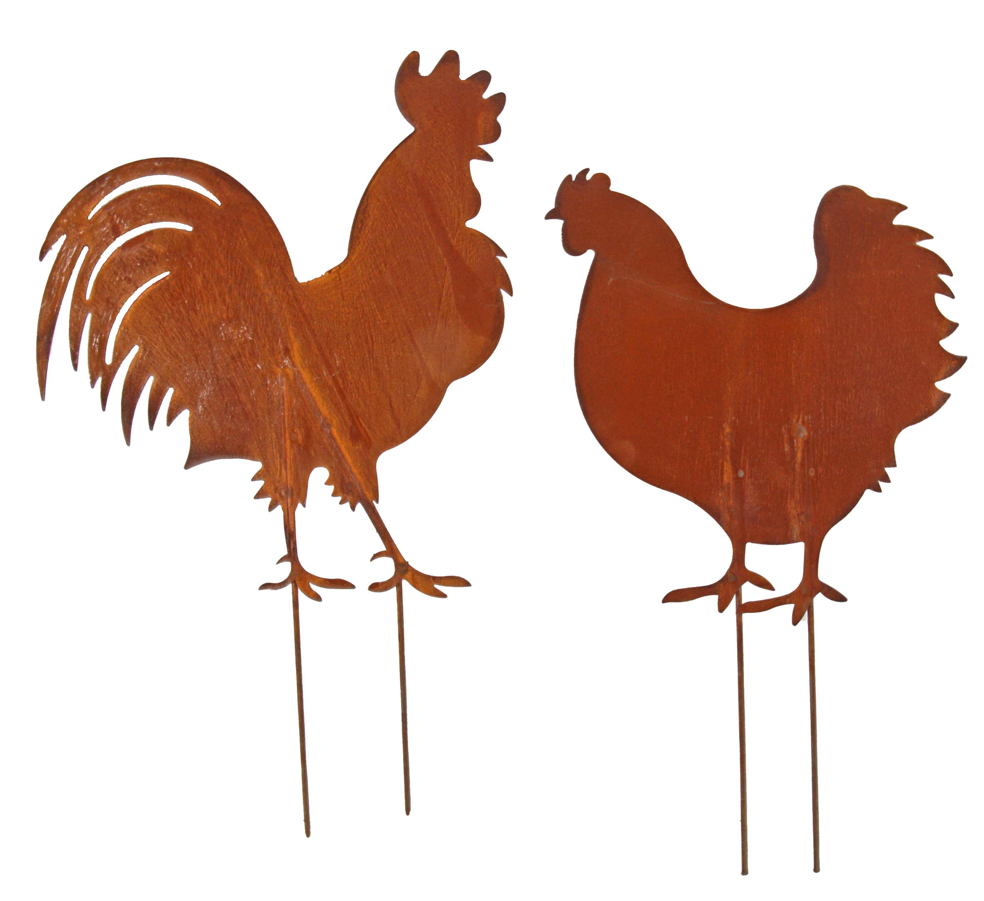 Gefertigt aus robustem Metall, überzeugt das Set durch seine stabile Verarbeitung und die charaktervolle Edelrost-Patina. Die langen Erdspieße sorgen für einen sicheren Halt im Boden – ideal für Garten, Vorgarten, Terrasse oder Balkon. Ob einzeln platziert oder gemeinsam als harmonisches Duo – diese stilvolle Gartendekoration ist ein echter Blickfang zu jeder Jahreszeit.