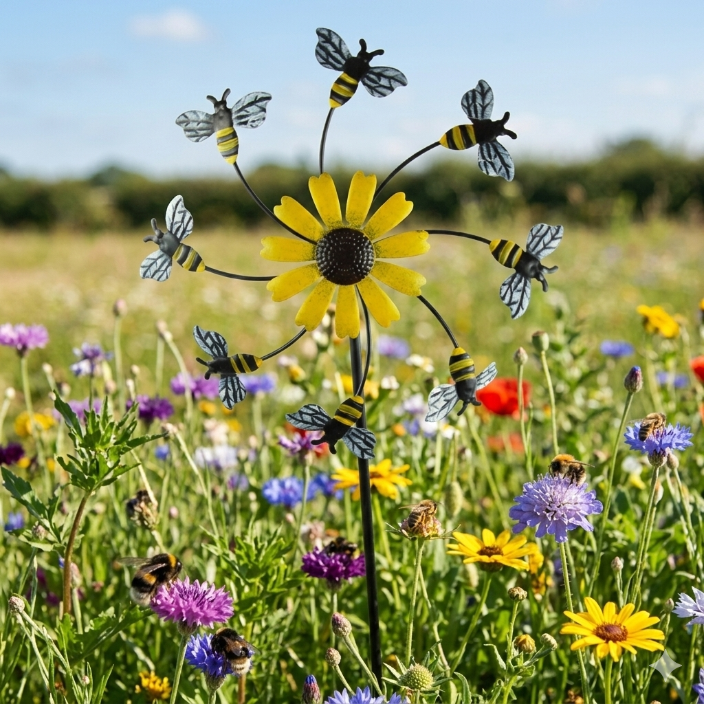 Dieses dekorative Windrad bringt Farbe und Bewegung in Ihren Garten. In der Mitte strahlt eine lebendige gelbe Sonnenblume, die für eine fröhliche Atmosphäre sorgt. Die Rotorblätter sind als niedliche Bienen gestaltet, die bei Wind spielerisch um die Blüte kreisen. Das Windrad ist ideal für den Außenbereich geeignet. Ein echter Blickfang für Beete, Balkone oder Vorgärten!